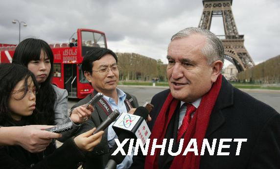 資料圖片:2008年4月6日,拉法蘭在巴黎埃菲爾鐵塔前接受部分中國駐法媒體記者聯(lián)合采訪。
