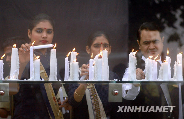 2009年11月26日,在印度孟買,奧貝羅伊酒店的工作人員點燃蠟燭悼念恐怖襲擊事件中的遇難者。2008年11月26日夜至29日,印度商業(yè)中心孟買的泰姬馬哈酒店、奧貝羅伊酒店、猶太人中心以及孟買火車站等地遭遇連環(huán)恐怖襲擊,造成至少195人死亡,大約300人受傷。新華社發(fā)