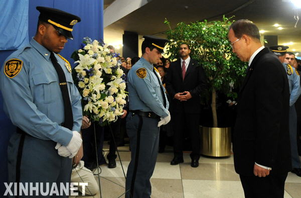 1月19日,聯(lián)合國秘書長潘基文(右)在紐約聯(lián)合國總部為海地地震遇難者舉行的悼念活動(dòng)上默哀。當(dāng)日,聯(lián)合國總部舉行花圈敬獻(xiàn)儀式和燭光悼念活動(dòng),向在海地地震中遇難的聯(lián)合國工作人員及所有的地震遇難者表示哀悼。新華社記者申宏攝