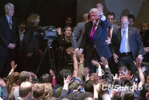 當?shù)貢r間2月24日下午,美國前總統(tǒng)克林頓在加州大學伯克利分校談“世界公民”的職責。他指出,當今世界相互依存,相互幫助,共同發(fā)展。世界公民應把自己美好的意愿化為實際行動,積極參與世界事務,履行世界公民的職責。圖為演講結束后,克林頓受學生歡迎的場面。 中新社發(fā) 陳鋼 攝
