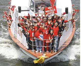 數(shù)萬名泰國紅衫軍14日自泰國各地涌向首都曼谷,試圖迫使泰國總理阿披實解散國會并下臺。圖為部分紅衫軍當(dāng)天乘船前往曼谷的情景。
