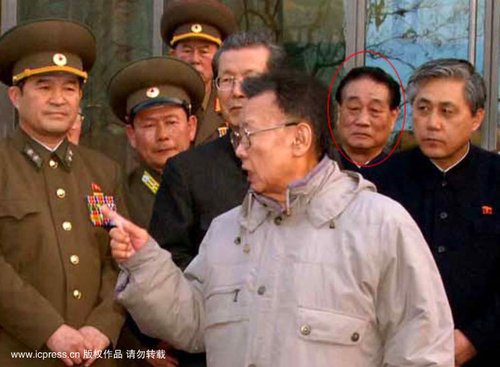 勞動(dòng)黨計(jì)劃財(cái)政部長(zhǎng)樸南基(紅圈中)可能在上周因?yàn)樨泿鸥母锸《粯寷Q。圖片是2009年3月,金正日視察Kimilsung 大學(xué)時(shí),樸南基陪同。
