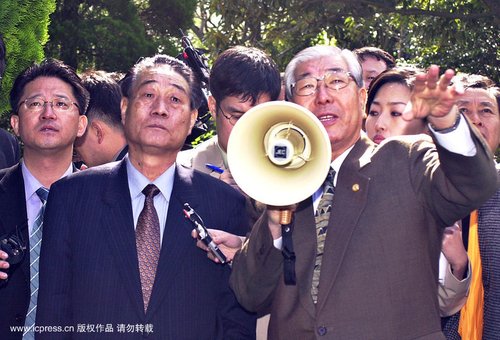 勞動(dòng)黨計(jì)劃財(cái)政部長(zhǎng)樸南基(前左)可能在上周因?yàn)樨泿鸥母锸《粯寷Q。圖片是2002年樸南基參觀韓國(guó)最南邊的Jeju 島。