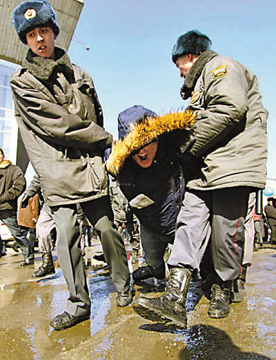 俄羅斯警方拘捕一名示威者。