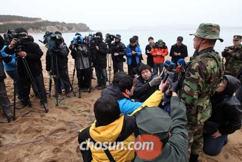 1日上午,韓國(guó)海軍陸戰(zhàn)隊(duì)大隊(duì)長(zhǎng)在仁川甕津郡白翎島長(zhǎng)村浦口海岸邊向記者介紹搜救工作的進(jìn)展?fàn)顩r。