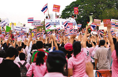 這批“粉衫軍”包括來自曼谷朱拉隆功大學(xué)的師生、旅游業(yè)者和“和平網(wǎng)絡(luò)”組織的成員,有人稱他們?yōu)椤胺奂t運(yùn)動(dòng)”。在前副警察總長瓦西和朱拉隆功大學(xué)政治科學(xué)系主任乍叻帶領(lǐng)下,他們昨日在倫披尼公園內(nèi)的拉瑪四世像前宣誓,矢言保護(hù)國家,同時(shí)聯(lián)署請(qǐng)?jiān)感,反?duì)解散國會(huì)和修改憲法,指此舉不符合國家最佳利益。