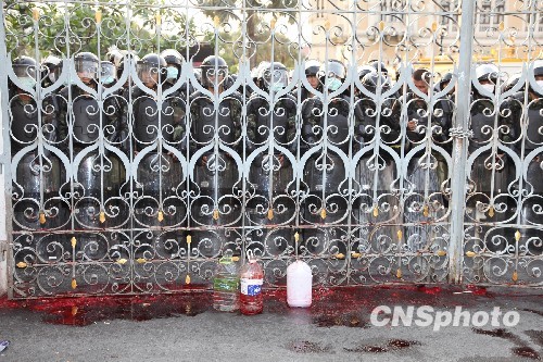 曼谷當(dāng)?shù)貢r(shí)間3月16日下午4時(shí)許,泰國紅衫軍將上午從成千上百的紅衫軍身上抽取的鮮血裝在幾十個(gè)塑料罐里,并聲勢浩大地來到曼谷總理府大門前舉行“血灑總理府”儀式。紅衫軍核心頭目納塔兀表示,自今天起將分階段對總理府、執(zhí)政民主黨總部和阿披實(shí)官邸潑灑100萬毫升基層民眾的鮮血,目的是令“內(nèi)閣官員踐踏人民鮮血”,向政府施壓迫其解散國會。圖為灑在總理府鐵門前的鮮血。 中新社發(fā) 顧時(shí)宏 攝
