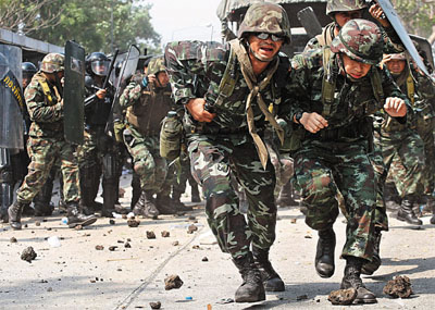 泰國士兵被紅衫軍猛烈圍擲石頭。