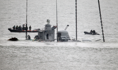 4月12日,韓國民間企業(yè)用鐵鏈綁住天安艦艦尾,從水深45米處轉(zhuǎn)移至白翎島近海水深25米處。