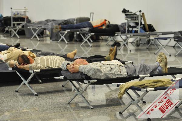 4月16日,在比利時(shí)首都布魯塞爾國(guó)際機(jī)場(chǎng),因航班取消而滯留機(jī)場(chǎng)的旅客在臨時(shí)休息區(qū)休息。新華社記者武巍攝
