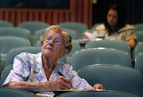 94歲的海蘇·蘇亞雷斯上課時(shí)認(rèn)真記筆記