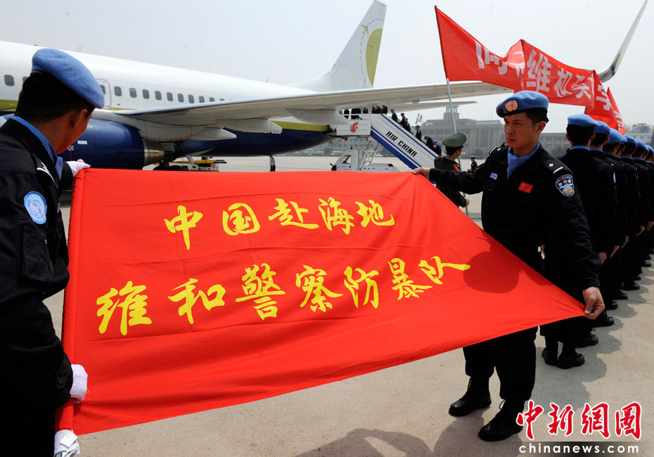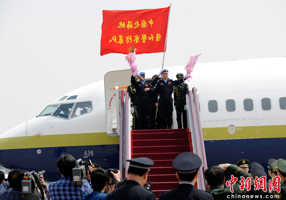 5月4日,中國(guó)第八支赴海地維和警察防暴隊(duì)全體隊(duì)員乘坐聯(lián)合國(guó)包機(jī)返回祖國(guó)。公安部副部長(zhǎng)孟宏偉、政治部主任蔡安季前往機(jī)場(chǎng)迎接。 中新社發(fā) 劉震 攝
