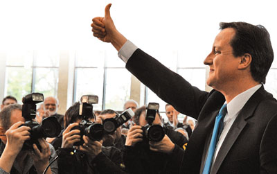 保守黨支持率領(lǐng)先,黨魁卡梅倫展示勝利手勢。