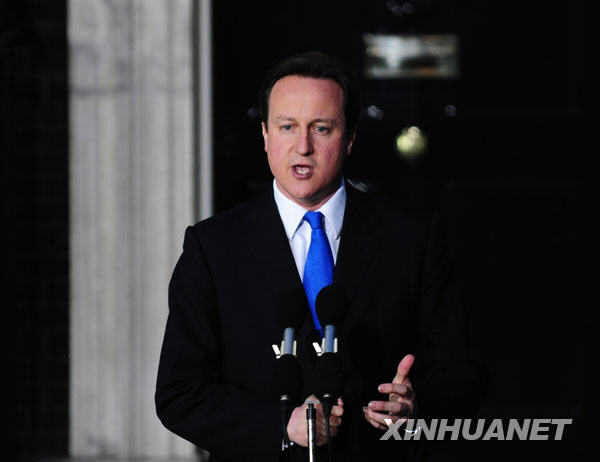卡梅倫在唐寧街10號首相官邸前發(fā)表講話說,他和自由民主黨領(lǐng)導(dǎo)人克萊格將拋開政黨分歧,為了公眾和國家的利益而努力工作。為此,他將與自民黨結(jié)成聯(lián)盟,組建一個“強大而穩(wěn)定的政府”。