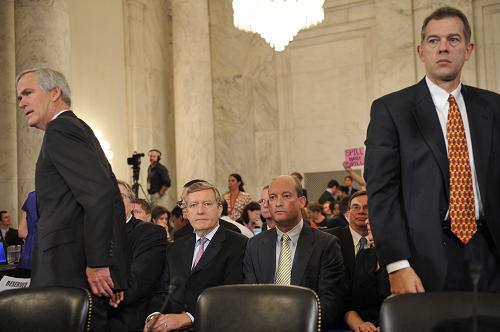 5月11日,在美國(guó)首都華盛頓國(guó)會(huì)山,英國(guó)石油公司美國(guó)分公司總裁和董事會(huì)主席拉馬爾·麥凱(前排坐者,右)出席參議院能源和自然資源委員會(huì)就墨西哥灣原油泄漏事件舉行的聽(tīng)證會(huì)。新華社記者張軍攝