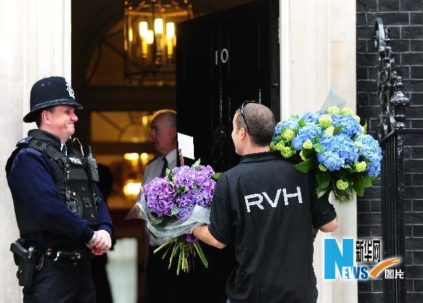 5月12日,在英國(guó)首都倫敦,一名送花的男子準(zhǔn)備進(jìn)入首相官邸唐寧街10號(hào)。唐寧街10號(hào)5月11日迎來(lái)英國(guó)新首相、保守黨領(lǐng)袖卡梅倫。新華社記者曾毅攝