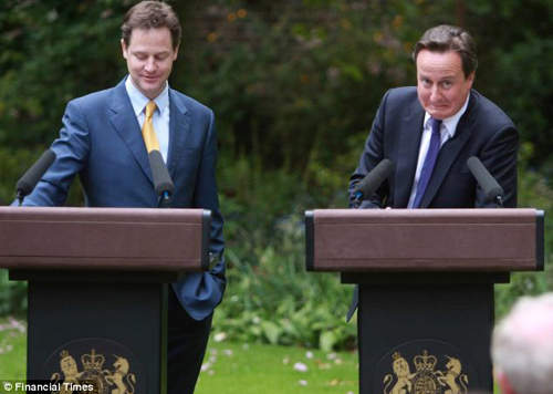 報(bào)道稱,首相卡梅倫和副首相克萊格肩并肩的站在光影斑駁的唐寧街花園。他們共同分享幽默,數(shù)次含義頗深的眼神交流讓所有人都認(rèn)為他們并不是要刻意制造歡樂(lè)的氣氛。