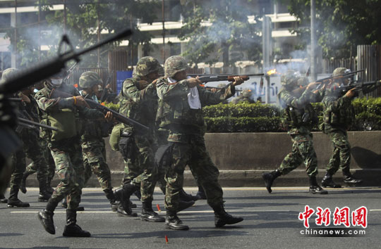 美聯(lián)社在報(bào)道中表示,泰國(guó)軍隊(duì)向示威人群開(kāi)槍、發(fā)射催淚彈,并向紅衫軍集會(huì)地點(diǎn)推進(jìn)。