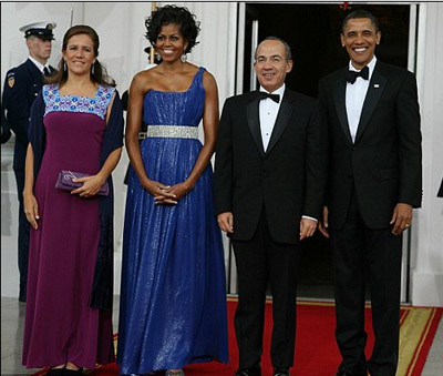 在宴會(huì)上,奧巴馬與卡爾德龍為兩國(guó)友誼互相祝酒。此次國(guó)宴,奧巴馬夫婦再次邀請(qǐng)了他們喜歡的高級(jí)廚師里克·貝雷斯準(zhǔn)備菜肴。
