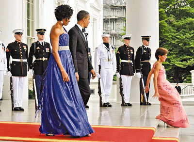 據(jù)香港《文匯報(bào)》報(bào)道,美國總統(tǒng)奧巴馬19日在白宮設(shè)宴款待來訪的墨西哥總統(tǒng)時(shí)發(fā)生一段小插曲,白宮的禮儀官準(zhǔn)備迎接貴賓時(shí),忽然跌一跤,整個(gè)人坐在階梯上,受驚的她立刻站起來,開玩笑警告攝影記者不要拍照。