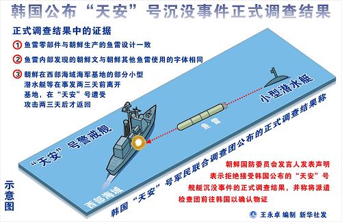 “天安”號(hào)軍民聯(lián)合調(diào)查團(tuán)5月20日公布的正式調(diào)查結(jié)果說,綜合各種證據(jù)來看,“天安”號(hào)警戒艦是遭受朝鮮小型潛水艇發(fā)射的魚雷攻擊而沉沒的。