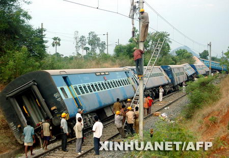幾名鐵路工人在印度安得拉邦維沙卡帕特南附近列車出軌現場進行善后處理。新華/法新