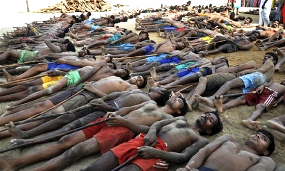 在一場祈雨的儀式上,村民們手持棍子躺在地上,祈求下雨,緩解高溫。