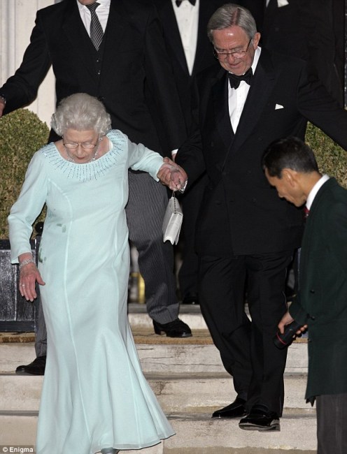 聚會(huì)結(jié)束后,在康斯坦丁國(guó)王的幫助下,已經(jīng)84歲的女王走下樓梯離開。