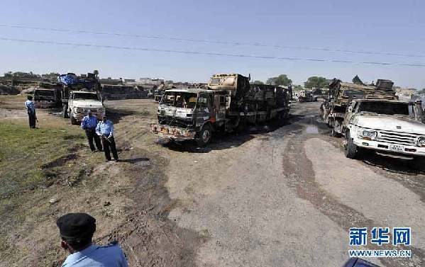 資料圖片:6月9日,在巴基斯坦首都伊斯蘭堡附近,巴基斯坦警察在被毀的北約車輛附近警戒。由約50輛油料和物資運(yùn)輸車組成的北約車隊(duì)8日深夜在巴基斯坦首都伊斯蘭堡附近遭到不明身份武裝分子襲擊,造成至少8人死亡、6人受傷,30多輛車被焚毀。 新華社/法新