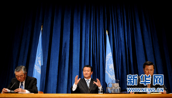 6月15日,在美國紐約聯合國總部,朝鮮常駐聯合國代表申善昊(中)回答記者提問。申善昊在當日的記者會上說,韓國公布的所謂“天安”號沉沒事件調查結果“純屬偽造”。新華社記者申宏攝