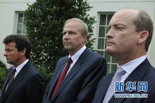 6月16日,在美國首都華盛頓白宮,英國石油公司首席執(zhí)行官托尼·海沃德(左)、總經(jīng)理羅伯特·達德利(中)和英國石油公司美國分公司總裁拉馬爾·麥凱與媒體見面。新華社記者張軍攝