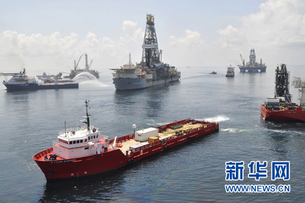 這張攝于6月15日的照片顯示,船只在墨西哥灣“深水地平線”鉆井平臺泄漏現(xiàn)場清理原油。英國石油公司16日表示,將拿出200億美元建立墨西哥灣石油泄漏事件賠償基金。新華社發(fā)(美國海岸警衛(wèi)隊/鮑勃·勞拉攝)