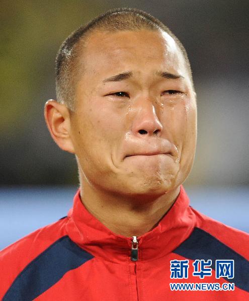 6月15日,朝鮮隊(duì)球員鄭大世在奏朝鮮國歌時(shí)淚流滿面。當(dāng)日,在2010南非世界杯小組賽G組比賽中,朝鮮隊(duì)對陣巴西隊(duì)。 新華社記者李尕?cái)z