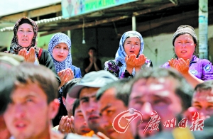 19日在奧什街頭,一群烏茲別克族婦女在祈求和平。