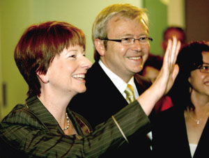 資料圖:澳大利亞現(xiàn)總理陸克文(右)和將擔任總理的吉拉德(左)在首都堪培拉參加會議。