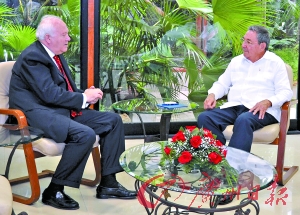 7日,古巴領(lǐng)導(dǎo)人勞爾·卡斯特羅(右)與到訪的西班牙外長莫拉蒂諾舉行會談。