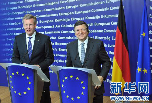 7月8日,在比利時(shí)首都布魯塞爾,德國新任總統(tǒng)武爾夫(左)與歐盟委員會主席巴羅佐舉行會談后一同出席新聞發(fā)布會。新華社記者武巍攝