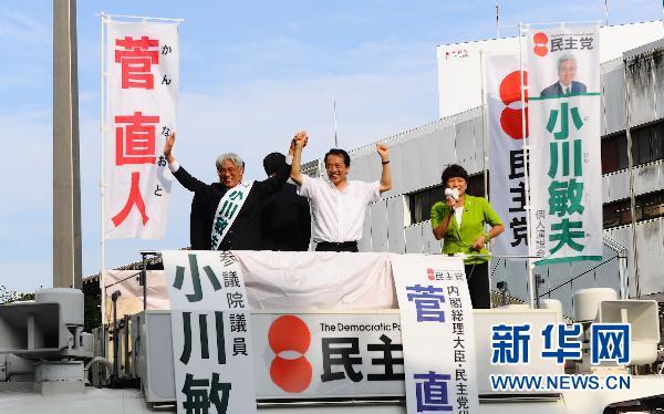 7月10日,在日本東京都武藏野市吉祥寺車站,日本民主黨代表(黨首)、首相菅直人(中)向人群揮手致意。當(dāng)日,菅直人來到東京都武藏野市吉祥寺車站,發(fā)表演說,為民主黨參議院選舉候選人加油助威。日本各大政黨在投票前一天,紛紛走上街頭,爭取最后的支持。 新華社記者 季春鵬 攝