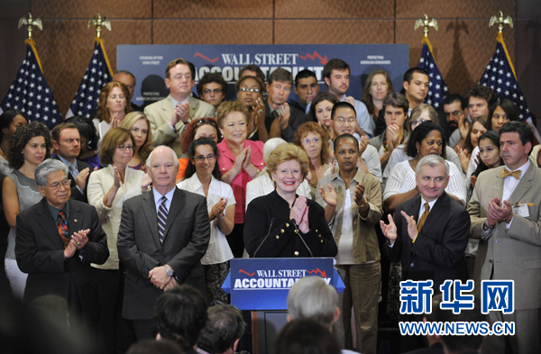 7月15日,在美國首都華盛頓國會山,參議員黛比·施塔貝諾(中)在最終版本金融監(jiān)管改革法案投票后舉行新聞發(fā)布會。美國國會參議院當(dāng)天通過最終版本金融監(jiān)管改革法案,為該法案最終成為法律清除了最后障礙。新華社記者張軍攝