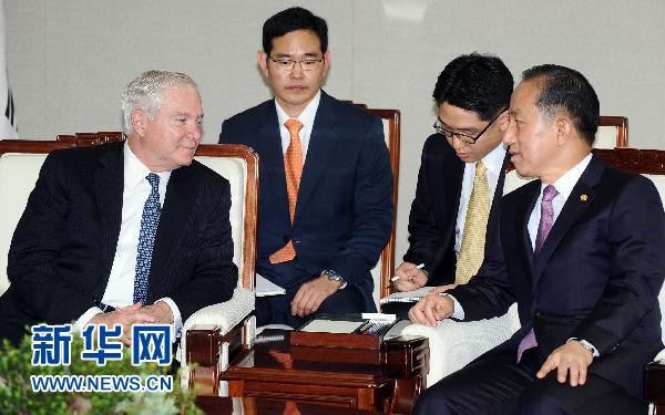 7月20日,在韓國首爾,韓國國防部長官金泰榮(前右)與美國國防部長羅伯特·蓋茨(前左)會談。韓國軍隊聯(lián)合參謀本部20日表示,韓國與美國決定于7月25日至28日在韓國東部海域(即日本海)舉行聯(lián)合軍事演習。韓國國防部長官金泰榮和來訪的美國國防部長羅伯特·蓋茨在當天的會談中商定了軍演的日期和規(guī)模。新華社/聯(lián)合通訊社