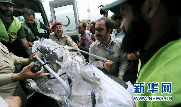 7月28日,在巴基斯坦首都伊斯蘭堡,救援人員將一名墜機(jī)遇難者的遺體運(yùn)抵一家醫(yī)院。當(dāng)日上午,一架載有152人的客機(jī)在巴基斯坦首都伊斯蘭堡附近的默爾加拉山墜毀。巴基斯坦警方說,失事現(xiàn)場已發(fā)現(xiàn)超過90具遇難者遺體。新華社/法新