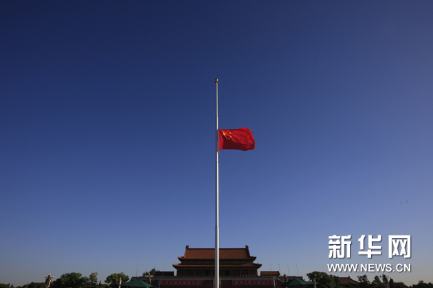 8月15日,北京天安門廣場降下半旗,向甘肅舟曲特大山洪泥石流遇難同胞志哀。新華社記者 任正來 攝