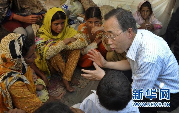 8月15日,聯(lián)合國秘書長潘基文(右一)在巴基斯坦旁遮普省與受災(zāi)者交談。聯(lián)合國秘書長潘基文當(dāng)日訪問巴基斯坦中部旁遮普省洪災(zāi)地區(qū)。他形容這場洪災(zāi)是他“所見最慘重的自然災(zāi)害”,呼吁國際社會加快向巴基斯坦施援。新華社/路透