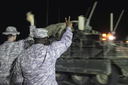 19日凌晨,2名美軍士兵向正在跨越伊拉克與科威特邊境線撤離的美軍部隊(duì)揮手。新華社發(fā)