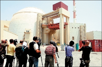8月21日,攝影記者在布什爾核電站反應(yīng)堆外拍照。