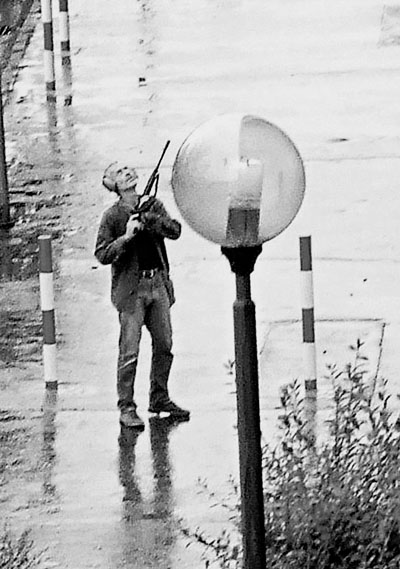 槍手戴著耳筒,在街上槍指周圍樓宇。