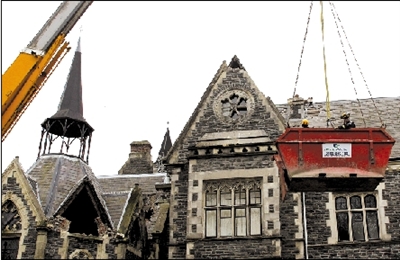 5日,新西蘭搜尋和救援人員利用起重機(jī)整修地震中受損的建筑。