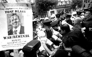 也有人“另辟蹊徑”,一名示威者說,她拿著書擠進(jìn)書店等待布萊爾簽名。大概布萊爾正簽名的時候,她說,她要以“戰(zhàn)爭罪”名義將布萊爾逮捕,布萊爾顯得有點(diǎn)吃驚,不過安保人員也很快反應(yīng)過來,隨即將她推開。