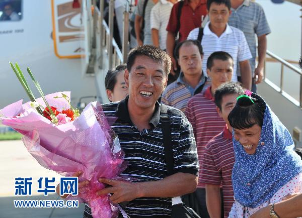 9月13日,來(lái)自福建省泉州市的李國(guó)金(前左)等走下飛機(jī)。當(dāng)日15時(shí),經(jīng)過(guò)中國(guó)政府嚴(yán)正交涉,被日方非法抓扣的14名中國(guó)漁民乘中國(guó)政府包機(jī)安全返抵福州。新華社記者 張國(guó)俊 攝