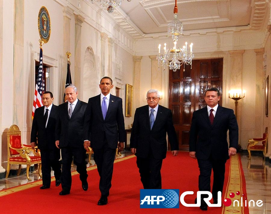 原版圖片中,各國領(lǐng)導(dǎo)人由左至右分別為:埃及總統(tǒng)穆巴拉克、以色列總理內(nèi)塔尼亞胡、美國總統(tǒng)奧巴馬、巴勒斯坦民族權(quán)力機(jī)構(gòu)主席阿巴斯、約旦國王阿卡杜拉二世。奧巴馬的位置略微靠前。(AFP/國際在線)